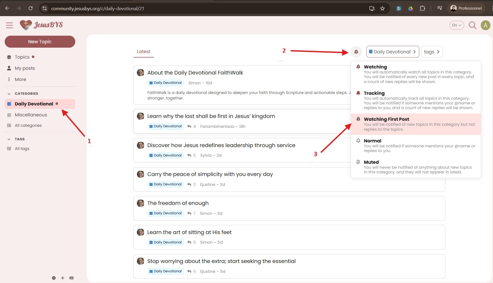 Algunos de ustedes han pedido recibir estos devocionales diarios por correo electrónico. Puedes hacer esto activando las notificaciones para esta categoría, como se muestra en esta imagen: